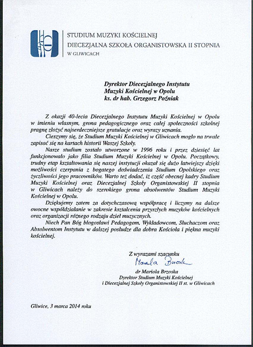 Życzenia jubileuszowe dla Diecezjalnego Instytutu Muzyki Kościelnej w Opolu przesłał rektor najstarszej w świecie szkoły muzyki kościelnej - Hochschule für Katholische Kirchenmusik und Musikpädagogik w Ratyzbonie (Regensburg, Niemcy) - prof. Stefan Baier.