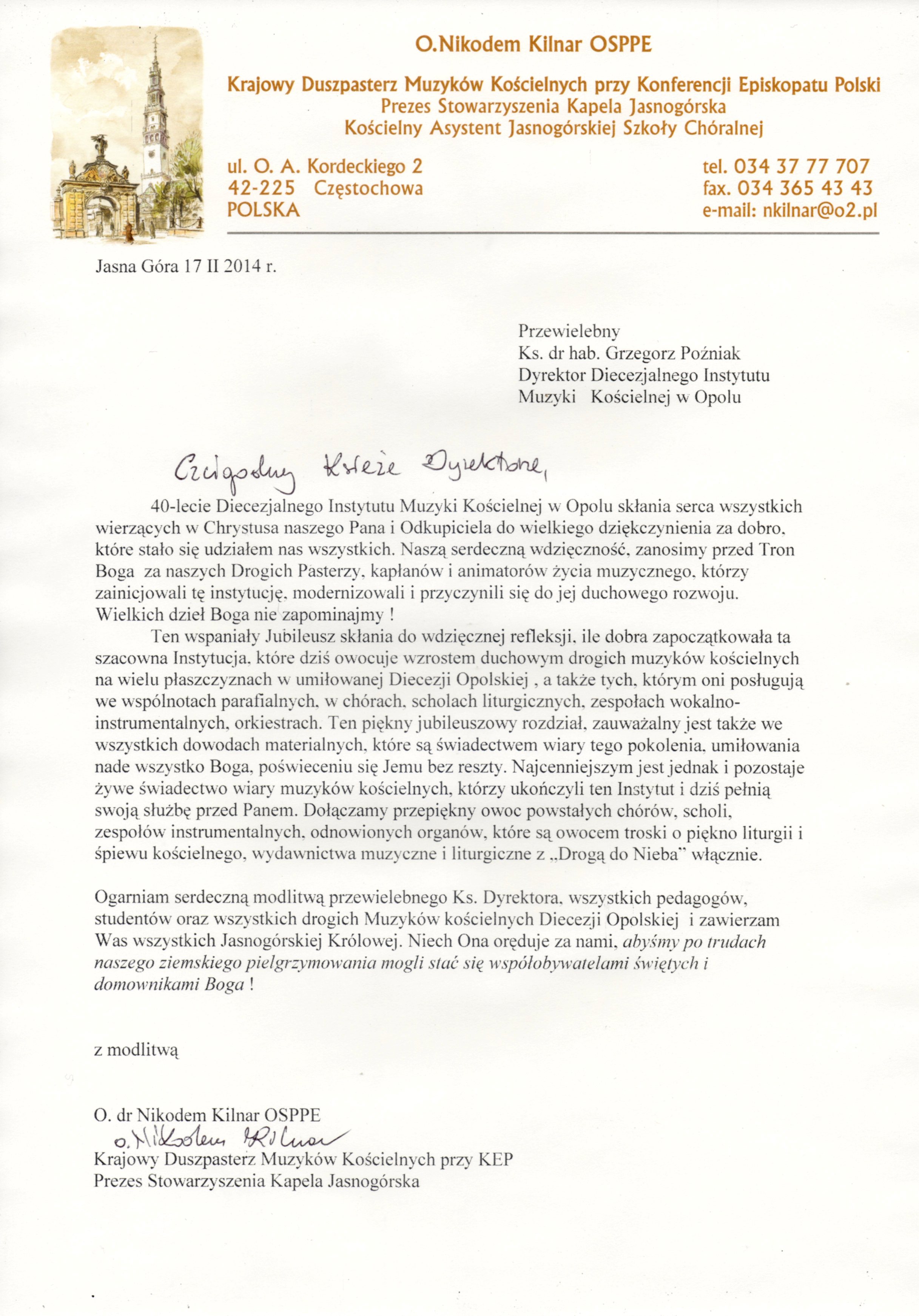 Na adres Diecezjalnego Instytutu Muzyki Kościelnej nadeszły pierwsze życzenia z okazji jubileuszu 40-lecia. Przesłał je Zastępca prezesa Stowarzyszenia Polskich Muzyków Kościelnych prof. dr. hab. Czesław Grajewski.