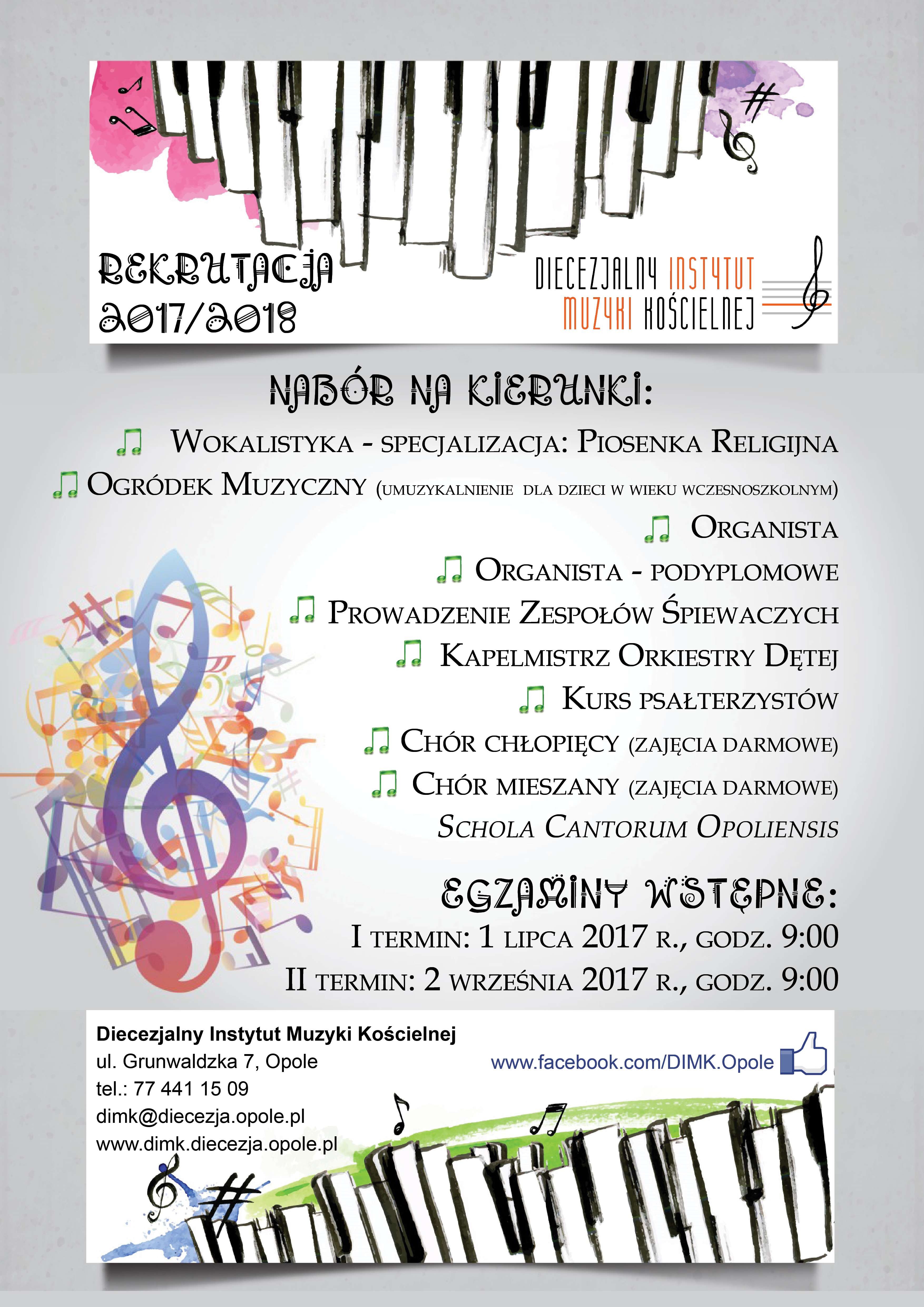 Diecezjalny Instytut Muzyki Kościelnej ogłasza nabór na rok szkolny 2017/2018.