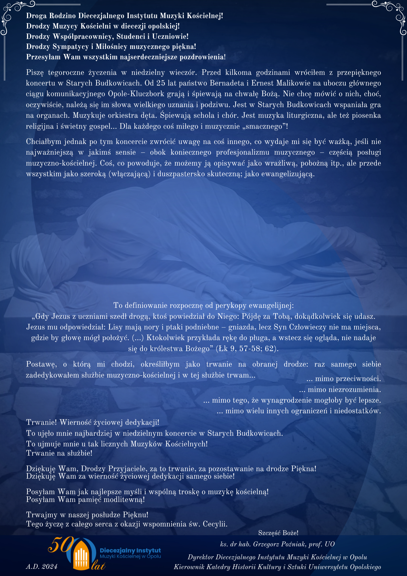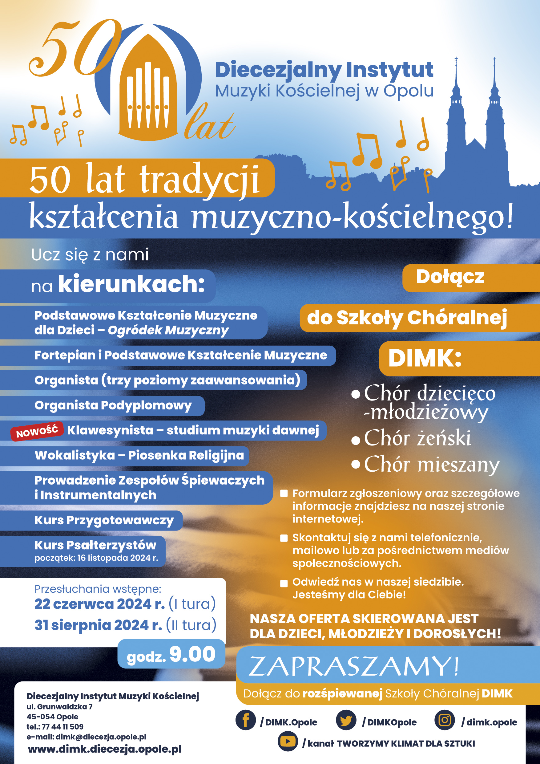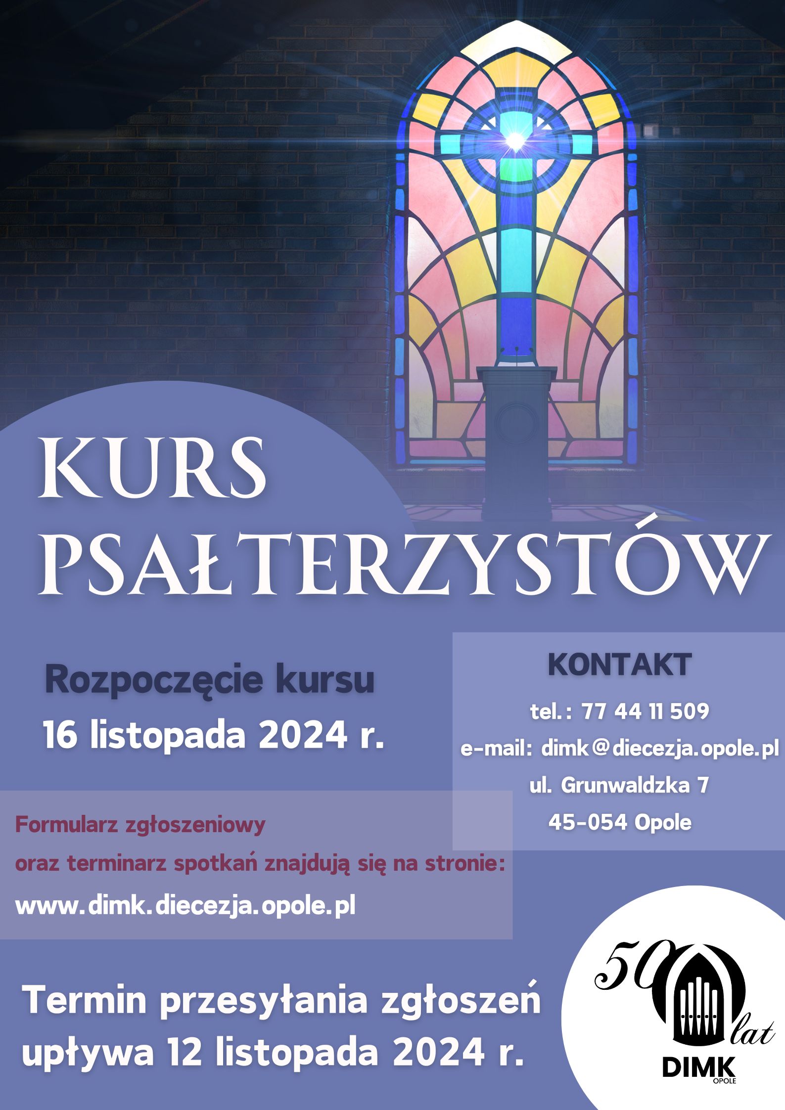 Zapraszamy do udziału w Kursie Psałterzystów, którego celem jest kompetentne przygotowanie muzyczne oraz formacja osób wykonujących psalmy responsoryjne w ramach liturgii. Program kursu obejmuje sobotnie spotkania formacyjne (wg wskazanego terminarza), podczas których uczestnicy biorą udział w wykładach z biblistyki, liturgiki, prawodawstwa muzyczno-liturgicznego i muzyki liturgicznej oraz uczestniczą w ćwiczeniach z emisji głosu, pozwalających im podnieść swoje umiejętności wokalne, a także poznać zasób melodii psalmowych. Koszt całego kursu wynosi 300 zł (płatność jednorazowym przelewem bankowym na konto podane na stronie DIMK do końca listopada; tytuł przelewu: imię i nazwisko, Kurs Psałterzystów). Całość zwieńczy uroczyste błogosławieństwo do pełnienia funkcji psałterzysty w zgromadzeniu liturgicznym, które nastąpi po zdanym egzaminie końcowym.