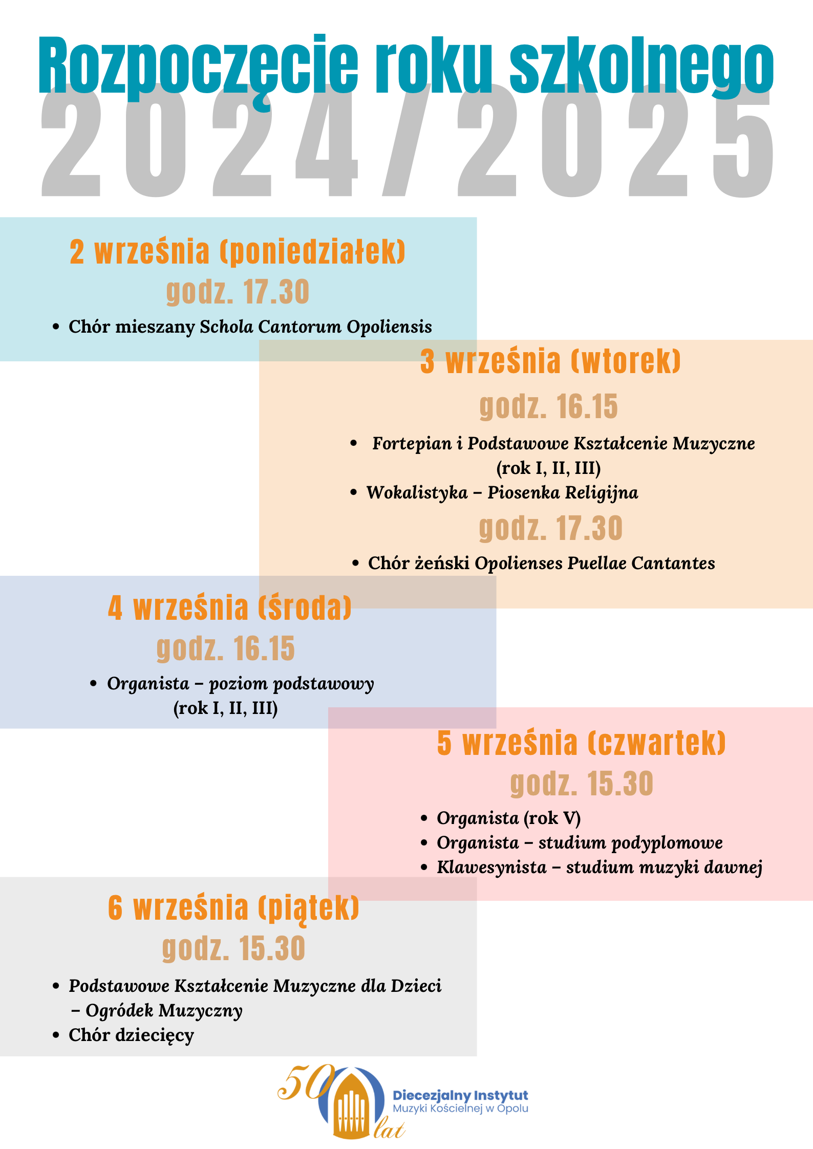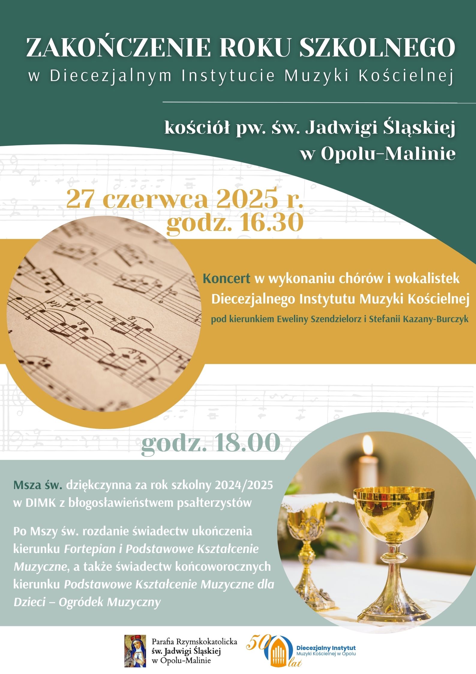 Z okazji zakończenia roku szkolnego zapraszamy na koncert w wykonaniu naszych chórów oraz wokalistek pod kierunkiem Eweliny Szendzielorz i Stefanii Kazany-Burczyk. Wydarzenie odbędzie się 27 czerwca 2025 r. (piątek) o godz. 16.30 w kościele pw. św. Jadwigi Śląskiej w Opolu-Malinie. Po koncercie sprawowana będzie Msza św. dziękczynna za miniony rok nauki, podczas której pobłogosławieni zostaną absolwenci tegorocznej edycji Kursu Psałterzystów. Po Mszy św. rozdane zostą świadectwa.