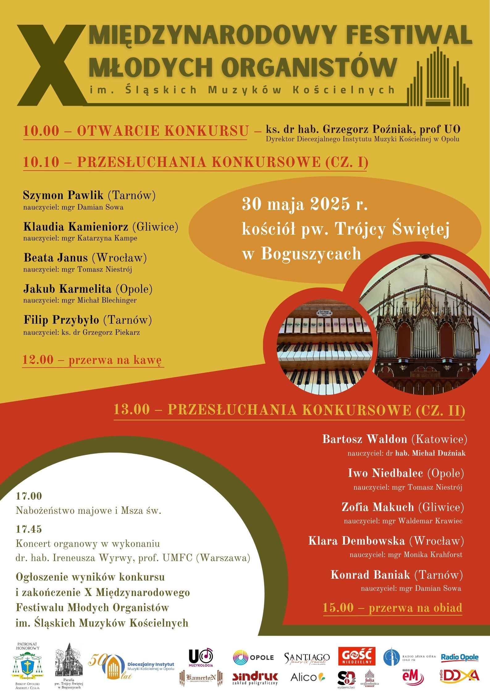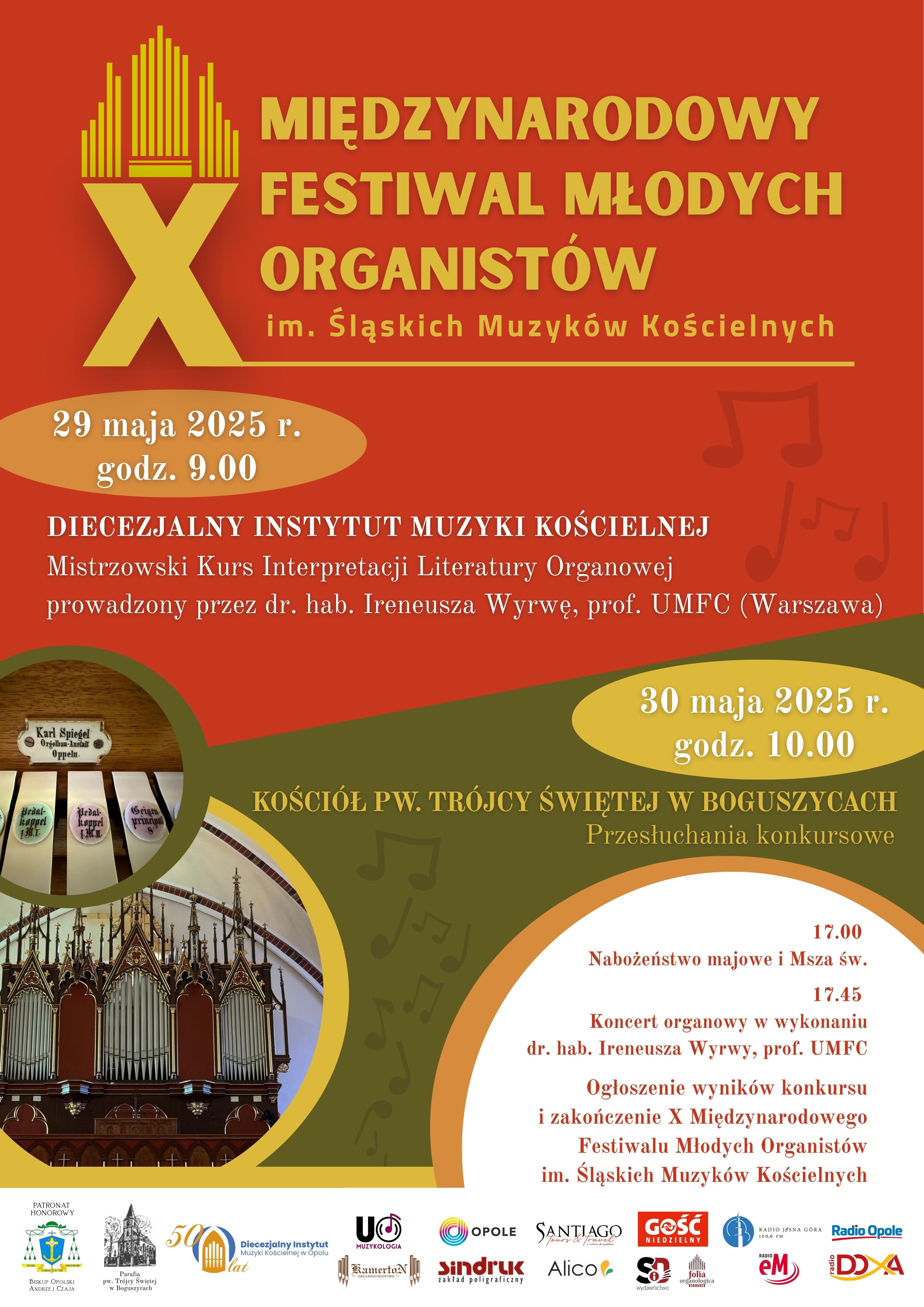 Jubileuszowa, dziesiąta edycja Międzynarodowego Festiwalu Młodych Organistów im. Śląskich Muzyków Kościelnych skupi w Opolu i Boguszycach przedstawicieli różnorodnych ośrodków kształcenia muzyczno-kościelnego w Polsce. Młodzi organiści zmierzą się z wykonawstwem literatury organowej w ramach przesłuchań konkursowych, a także będą mieli okazję wymiany doświadczeń oraz podzielenia się swoimi umiejętnościami ze słuchaczami. Niniejszy festiwal to także okazja do promocji rodzimej kultury muzycznej, muzyki organowej oraz kształcenia muzyczno-kościelnego. Zwieńczeniem festiwalu będzie koncert w wykonaniu prof. Ireneusza Wyrwy z Uniwersytetu Muzycznego Fryderyka Chopina w Warszawie, który w przeddzień konkursu poprowadzi także Mistrzowski Kurs Interpretacji Literatury Organowej. Zapraszamy do wysłuchania całodziennych popisów młodych organistów, a także gościa specjalnego – w piątek, 30 maja 2025 r., od godz. 10.00 w kościele pw. Trójcy Świętej w Boguszycach.