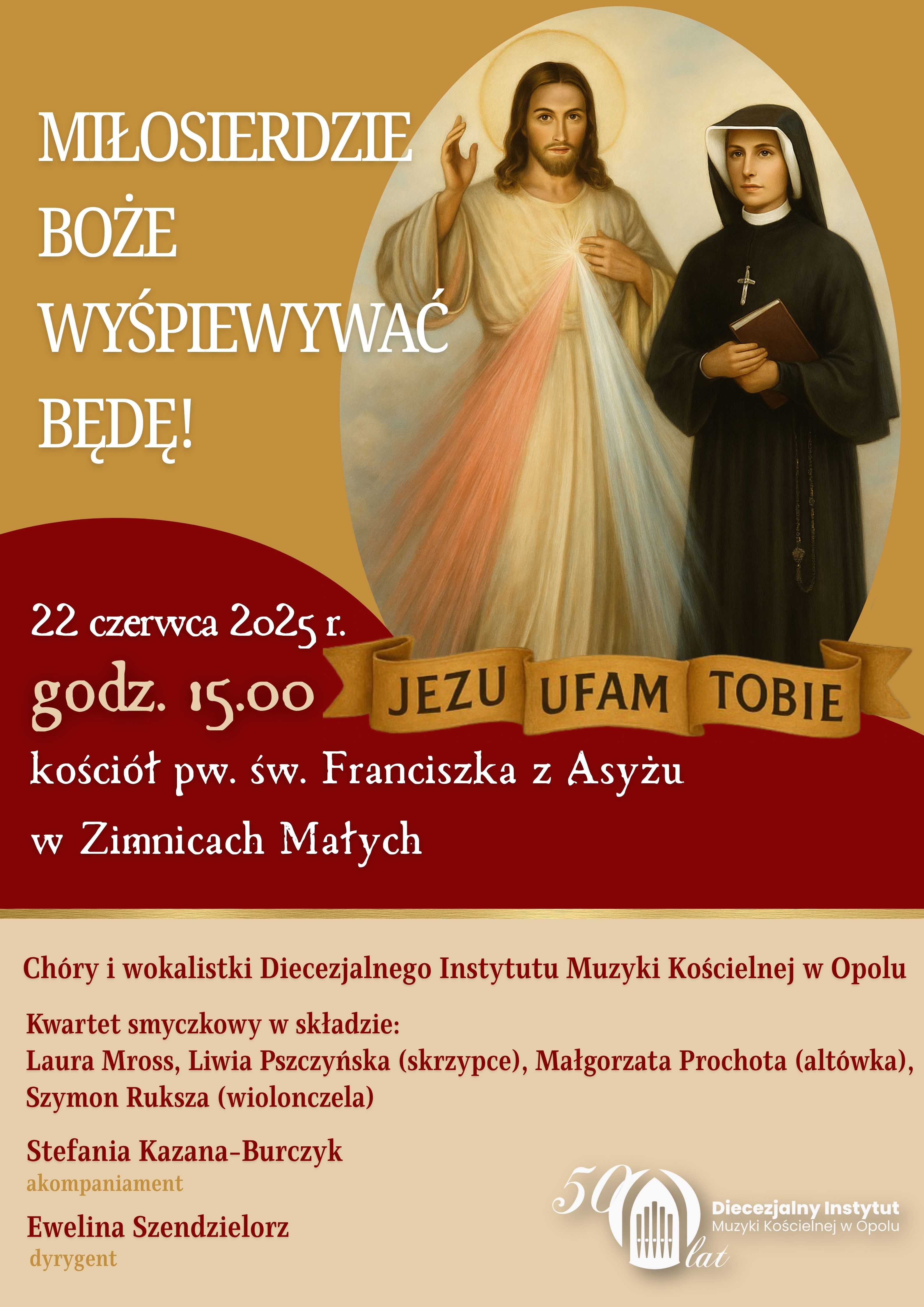 Zapraszamy na koncert dedykowany Bożemu Miłosierdziu! Odbędzie się on w kościele pw. św. Franciszka z Asyżu w Zimnicach Małych w niedzielę, 22 czerwca 2025 r., o godz. 15.00.